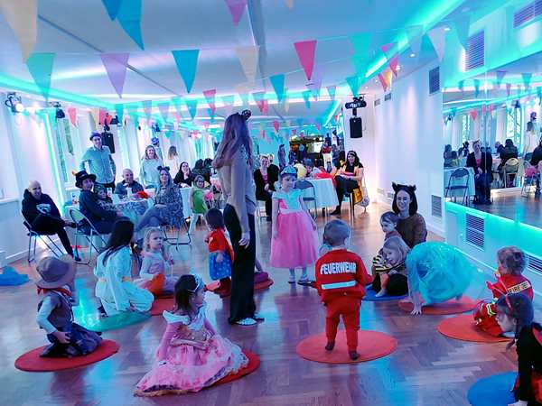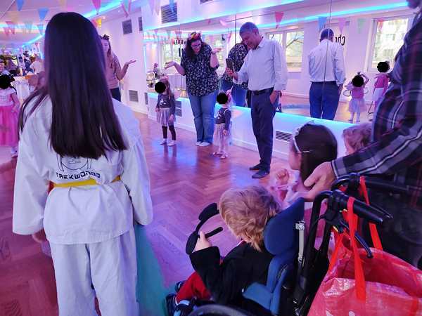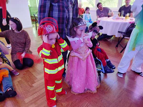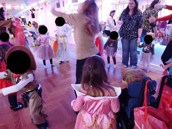The kids had gone to a weekly dance class there all of 2022, but we hadn't been back sinde. However, I still get their emails, and when I saw the info about the party, I decided it would be nice to go, as there was no other party today that we knew of. After we showed our tickets, we found out that they actually had an elevator that Randy and Sammy could ride up on. I walked up the stairs with the other two. There were already a lot of people and children there, in the big dance hall. They had set up tables, but we didn't have any seats as those were an additional expense.