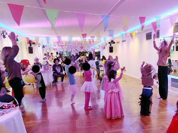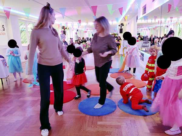 Then we went inside the dance hall, where the teachers were already doing children's songs/dances with them. A few kids were really participating all the time. Our kids were not that interested. They participated in some, and later it was only Tammy who joined the dance. They did participate in the games, though, like musical chairs with little carpets, or the freeze game.