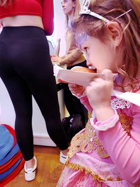 There was not much time to rest after lunch. Randy closed his eyes for a little bit, while the kids were on their tablets. Then I got them ready to leave, putting their costumes on them. At 2:15 we left the house together. We got on the subway, then had to take a bus. We had just missed one and had to wait nearly 10 minutes for the next one. Still, we got to the dancing school right on time.