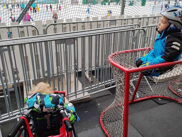And so we left at 3:40 pm to take two subways and go to the ice-skating rink. We put their shoes, gloves and helmets on and walked to the school area. It was a warm day with 16 degrees Celsius, and so the ice was covered in water. Emmy was not complaining or saying he did not want to go on the ice. I was surprised and impressed. When we reached the school area, they simply walked onto the ice and joined their class that had just started. However, he only stayed on the ice very briefly, before he came back off and walked to us. He said he wanted to drink, drank some, and returned to the ice. A few minutes later he came back again. This time he said his belly was hurting and that he couldn't ice-skate. So he sat down with us to watch Tammy. Emmy returned to the ice one more time a little later, only to return rather quickly again.
