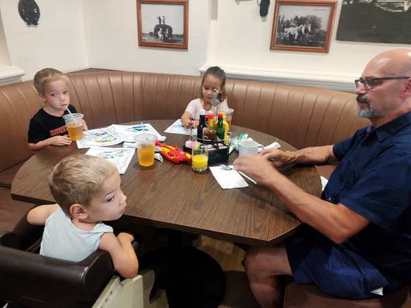 Day 1467. I had an alarm set for 7:40 this morning, but Emmy came to me just a few minutes before that time. He had not come to our bed all night, contrary to Tammy who came before I had even gone to bed and stayed all night. We got up and all crossed the street together to go to the diner that the hotel was using for breakfast. It was pretty unique. They had a room set aside for the hotel guests, and had a special menu for us that had three choices on it. She told us that the kids were getting the same full-size meals. Nice. We ordered, then I had to leave them there to return to my room, as I had a student at 8:30. I told them I'd come back after I was done if they were still there, but they returned to the room before I was done teaching. Randy then told me it had been a disaster. Sammy would not eat without me there.