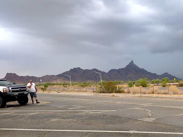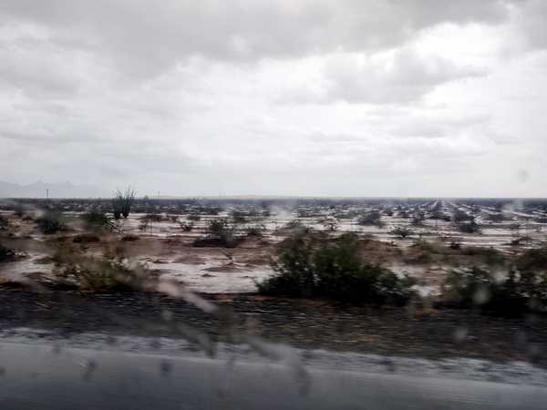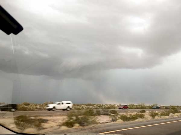 I ate my food that Randy had brought with him, together with what they had not eaten. Then I finished packing, and Randy loaded everything into the car right outside our room. It was nearly 10:30 before we left, and we had 400 miles to drive ahead of us. We drove and drove, mostly through desert. There were some dark clouds, and rain, and at times it looked like tornadoes forming. The rain was not going into the hardened desert ground, and so we could see puddles everywhere. But the rain did not last long and wasn't too bad. I was really tired and closed my eyes for a little bit, but someone always needs something from me, so I don't get to sleep.
