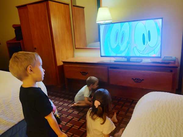 Randy unloaded the car, while the kids' were watching a kids' channel. Once he had brought our food inside, everyone ate some, then we put our swim suits on. Everyone was eager to get into the pool that we had passed by on the way to our room. It was an indoor pool.