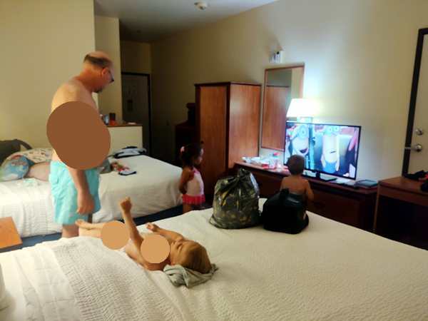 When we got to the pool, a sign on the door said that it was closed/out of order. Emmy started crying, and I was also really disappointed. We returned to our room, and everyone went into the bathtub, where they ended up having fun as well. After they came out, they had a little more to eat, then we got them ready for bed. By 9 pm they were in bed, but half an hour later they were still all awake. My plan to have them skip their nap to fall asleep faster at night was not working. Tammy fell asleep first, but the boys were still messing around. By 10 pm they were also quiet.