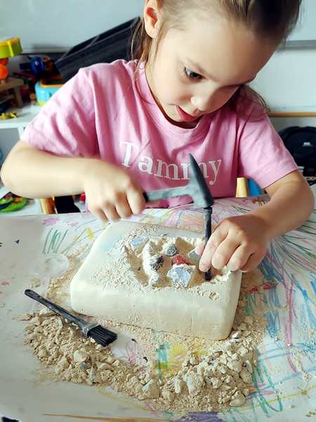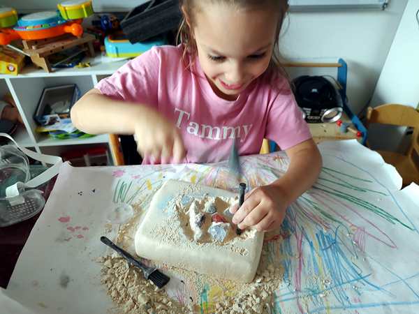 I don't know how it came up, but Tammy had still not dug out her precious stones out of the block of clay she had received as a gift at Easter, and she wanted to do it. I needed a break from work anyway, so I got the stuff and set it all up for her. She had to dig and also had a brush to brush off the dirt. There were 12 gemstones hidden in the block, and a few of them became visible quite quickly. There was also a crystal-growing kit included, and so I did that with Emmy. I got some hot water, then Emmy stirred it as I poured in the powder that would be the substance the crystals use to grow. We set it on a shelf, and now we just have to wait and watch.
