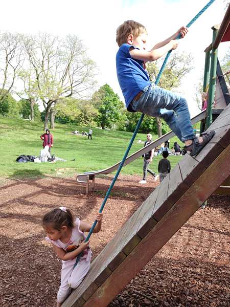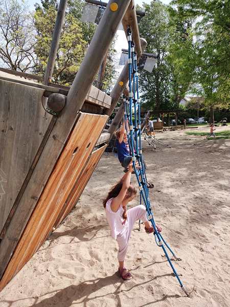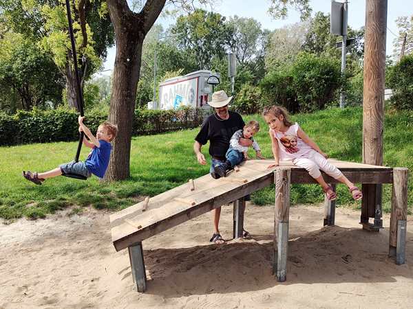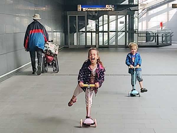Given the beautiful weather and that we were already out and about, we decided to go to the playground. I wanted to let them go without me, so that I could work on the German translation of the newsletter, but the kids wanted me to come as well, so I gave in. I hopped on the subway with them, as it was just arriving, while Randy went home to leave the swim stuff there and get the kids' helmets. It was the first time we let them take their scooters on a longer trip, as I wanted to see how well it goes, so that we can do that more often. Especially when we go to tennis class, as there is so much walking to get there and to get home after.