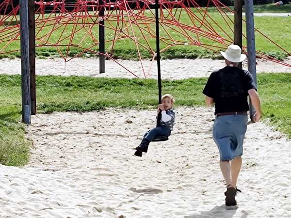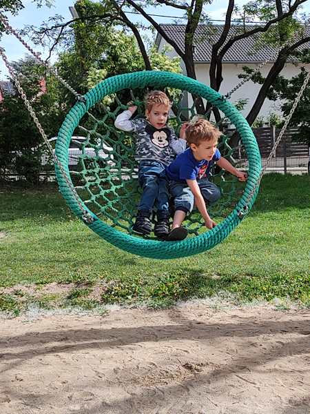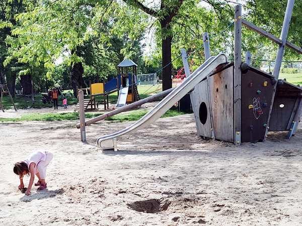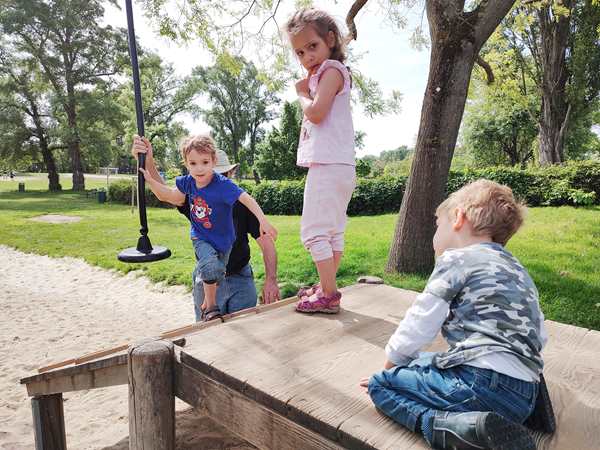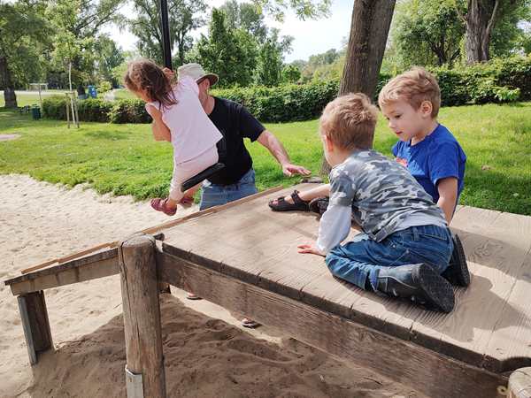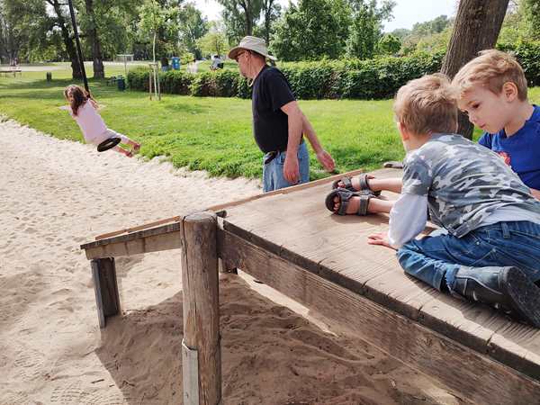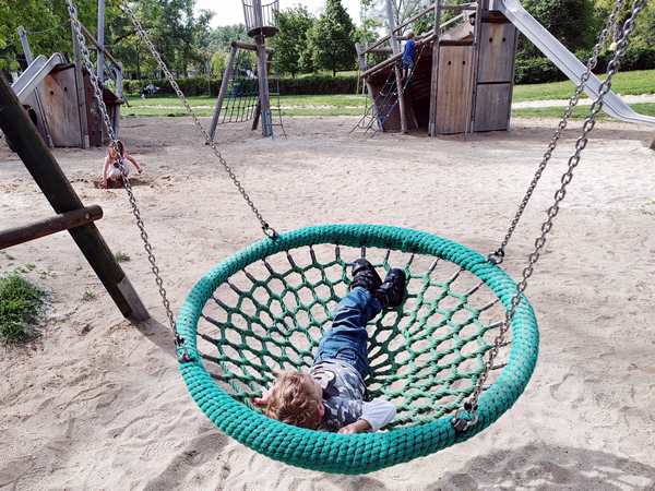 We rode the subway for one stop and got off. Then we walked down the street to the playground, which took some time. As it was still early, there were not a lot of people there at first, and the kids were enjoying themselves. Sammy went straight on the round swing and had lots of fun, as I was pushing him high. The other two were climbing and sliding. Emmy fell into a hole that someone had dug into the sand, which got Tammy's attention who then wanted to continue digging in the hole to make it bigger.