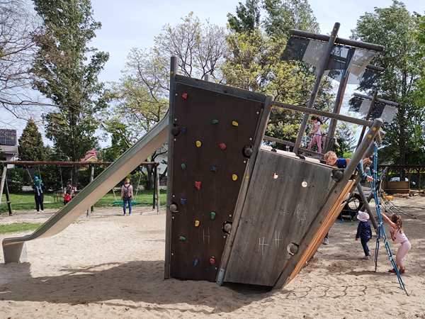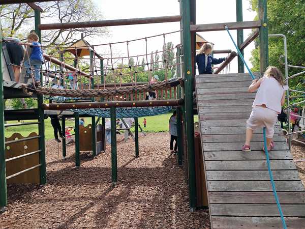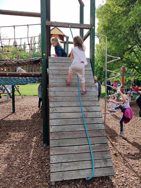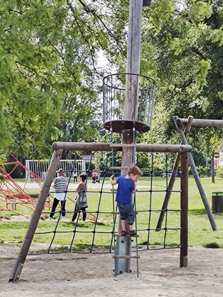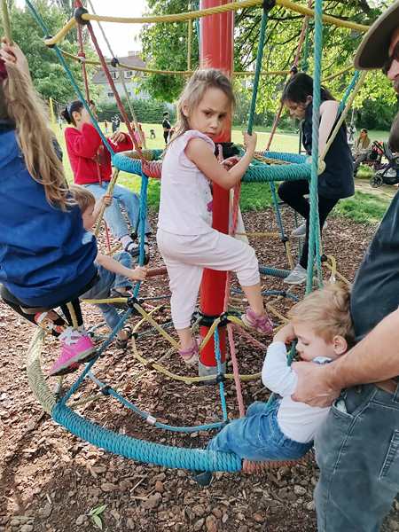 It was 4:30 pm, so we still had a little time before the service started at 5 pm, as the church was in walking distance. We walked in that direction and came to a nice playground. Because of the festival, it was the most crowded playground I had ever seen. Sammy saw the zipline and wanted to go o in it, but there were way too many kids. Tammy and Emmy climbed up the big climbing construct and climbed around on top. Then they went down the slide, and we all went to a climbing thing that turned. All the kids got on, as well as other kids, and I held Sammy and walked with him, while Randy turned the thing. When we got off, we decided to start our walk to church.