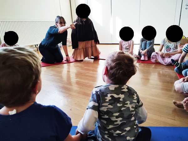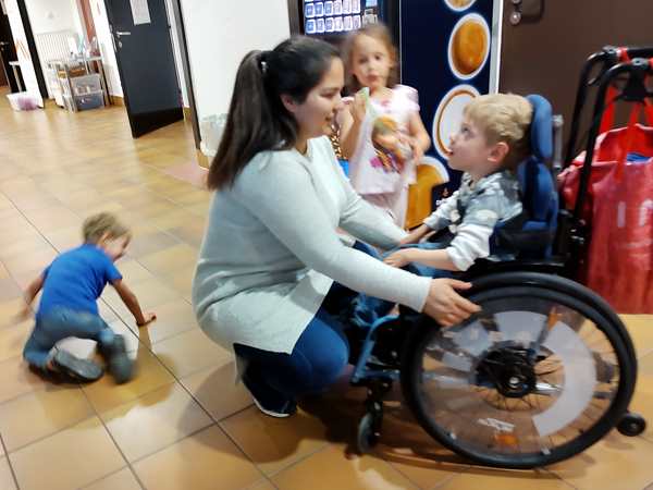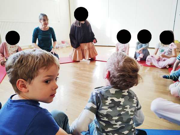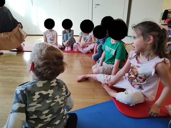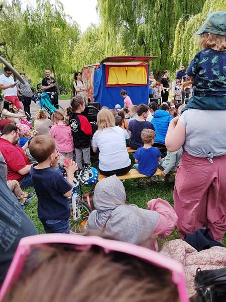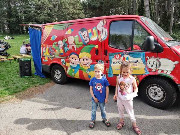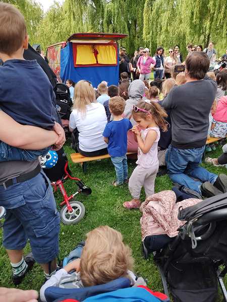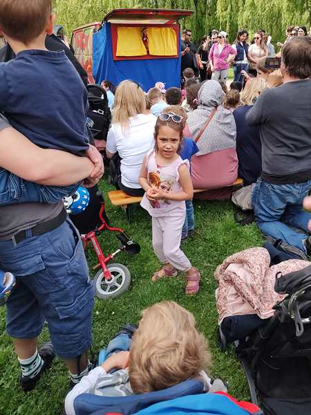 There was a spring festival/party there that had already started at 2 pm, but the question was where exactly in that big park. Thankfully we were heading in the right direction. When we got there, everyone was crowded around the "Kasperl" bus, and I figured that the performance was about to start. It was 3 pm, so we had arrived at exactly the right time. We found ourselves a good spot to watch, and then it already started. I had Emmy on my shoulders for a while, but then somebody got up from a bench, and Emmy sat down. As for Tammy, she ended up sitting on the wheelchair handles, as she didn't want to stand. It was a nice story they played, and the kids enjoyed it.
