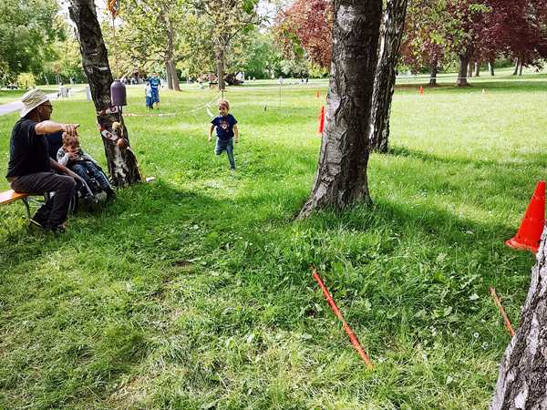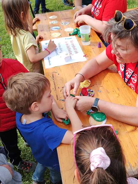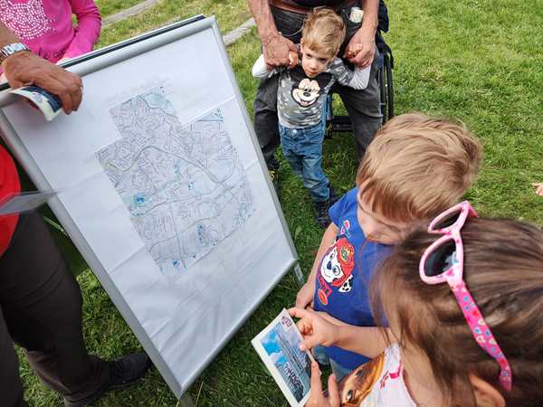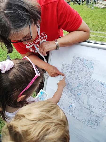 They had a map of the district on a board. While we waited for our turn, we were listening to the previous kids. They asked them where certain landmarks and streets were on the map. We were a long way from home and had no connection to the area, where we were. The kids had to draw a paper that then had a picture of something well-known in the district, and they were supposed to show where it was on the map. Of course they were not able to do that, so the lady showed them. They received a short lesson on the district and got their stamps. On to the next station.