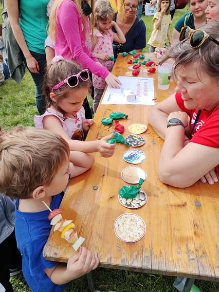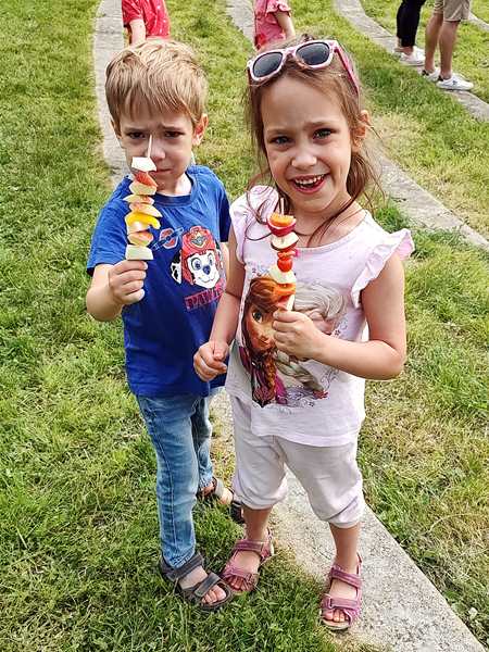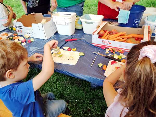 The next one was not a station where you got a stamp. They had fruits and vegetables and cutting boards and knives for the children. They were supposed to cut whatever they wanted and put the pieces on a skewer. Once they were done, we walked on, and the kids actually ate what they had put on - at least some of it.