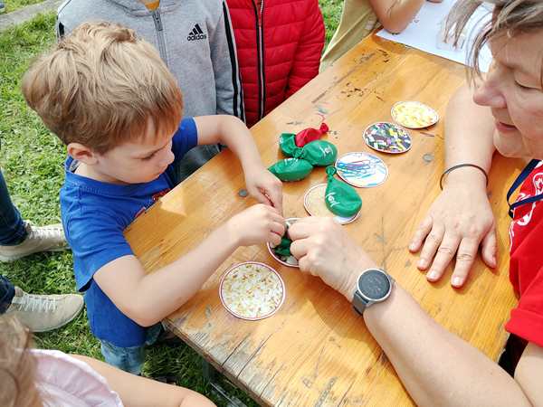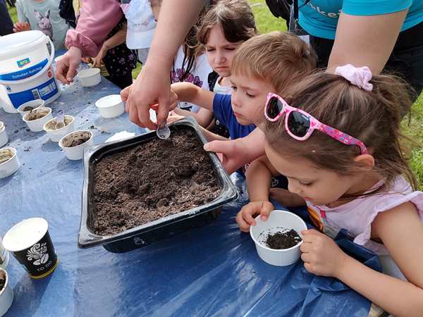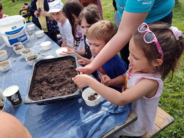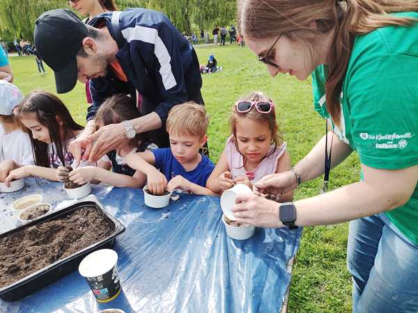 The next station was also one with no stamps. The kids got a little cup, some soil, some powdered clay, some seeds and some water. They then had to stir it all together with their hands and form a ball that they could take home with them to plant somewhere and hopefully watch flowers grow. They needed some help from the workers to get it done.