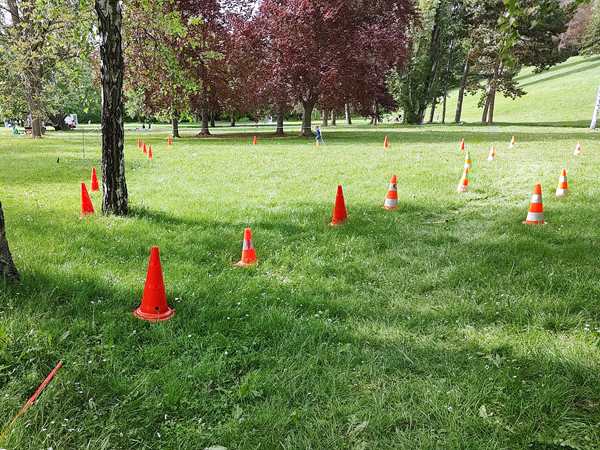 The first station was right there. They had boards to strap to and to walk with, but they were all taken. There were also sacks there, and so we did that. Tammy and Emmy each got into a sack and then jumped to the end of the set up cones and back. Then they received their stamps, and we walked on to the next station.