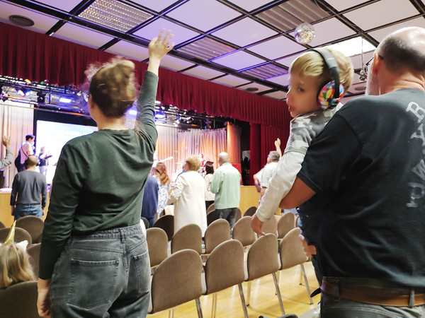 I was so exhausted that I didn't really want to go there, but we do what's best for the kids, right? We walked and walked and got to church five minutes before the service started. We got a seat in the sanctuary, and the kids ran to the front to where there was paper and crayons to draw, and that's what they did in the beginning of the service. Tammy then got a streamer to dance with, and Emmy wanted to run. Sammy was with me and Randy.
