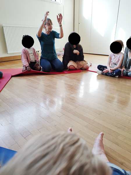 At 5:30 it was time to go to kids' church. It was Randy's turn to stay in the sanctuary. We sat down on the mats, and the pastor's wife started her teaching. She did some songs as well, and I had Sammy and helped him do the movements. As time went on, Sammy asked for Daddy, and he kept insisting. When he wants something this bad, there's no way out. I finally told him I'd go get Daddy. I also told the assistant teacher that I was leaving to get Randy and told the other two kids. Randy was less than happy, when I got him, but he left to go to the kids' room, while I sat down in the sanctuary.