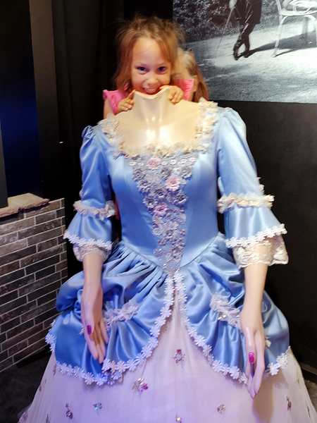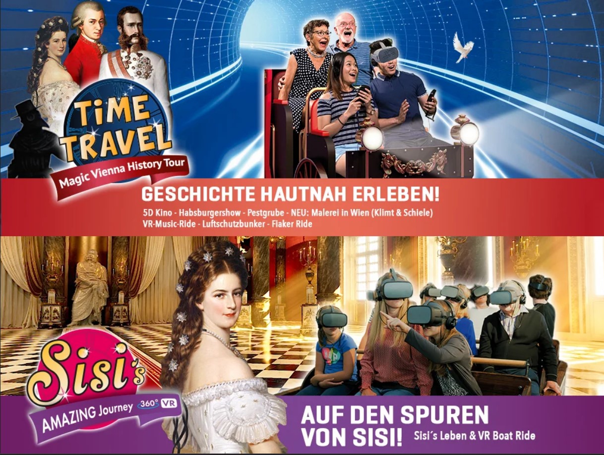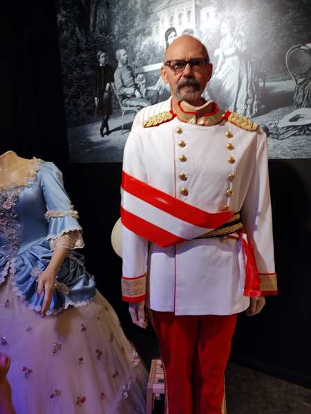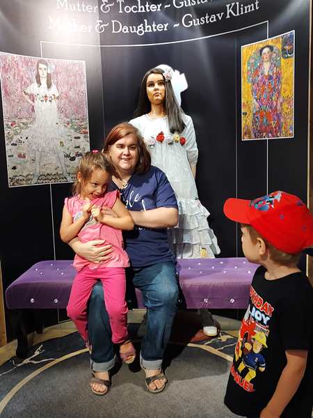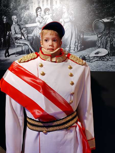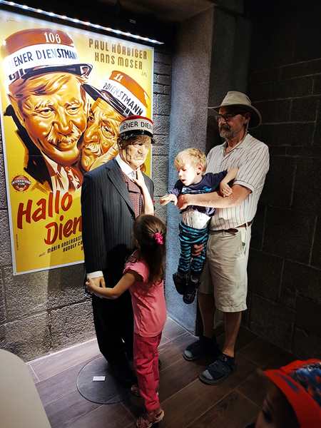 After the movie we walked on, through several rooms. We saw and heard the famous emperors of Austria talk, and we had a VR glasses experience to do with the great Austrian composers and music. We also went to a room, where we were allowed pictures and took some with ourselves in them. Then we continued on. We walked all the way through recent history, stood in a bunker during WWII, and took a carriage ride with horses that started flying. Then we ended up in the souvenir shop and it was over. It had lasted an hour, and we had half an hour until the start of part two on the other side of the street. And so we walked through the souvenir shop and looked at all they had. The kids wanted us to buy some stuff, but we didn't.