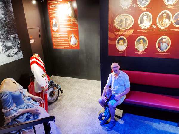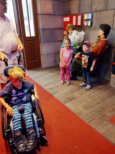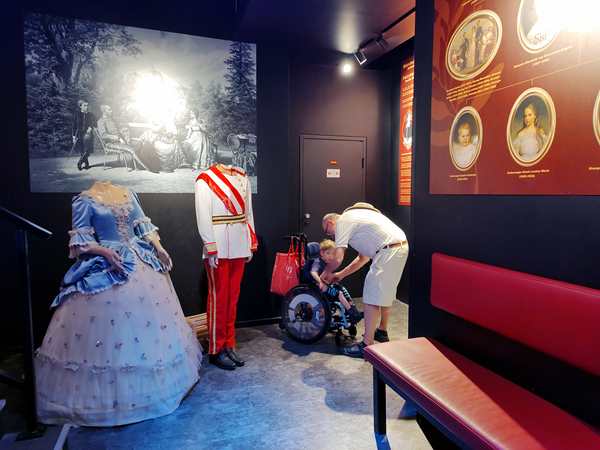 We'd had to carry Sammy through the museum because of all the stairs, but now we could put him back into his wheelchair. We went outside and stayed there for some minutes, while the kids were having snacks. Then we crossed the street, and the kids were impatient to go into the Sisi museum. That one was still new, and so I had never been there before myself. It was small and not as impressive as the first museum. We were sitting in the small waiting room, the kids being very impatient for 4:30 to come around. But in the end it did. We went inside and had to wait again for everyone to come in. Then we walked into a small theater. We sat up front. Sammy wanted to be with me, so I took him after a few minutes. But he didn't care whatsoever about the informative movie telling about Sisi's life. He got more and more antsy until Randy went outside with him. The other two, especially Tammy, didn't care that much either, but they made it to the end.
