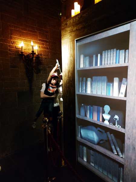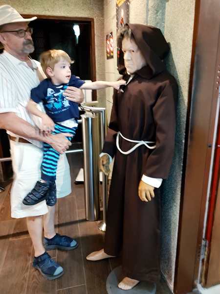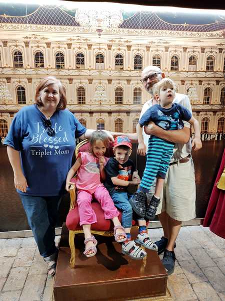 It's a unique museum in that it is multi-media, as you are taken through it. There were mannequins set up everywhere in the entry area, and we took some pictures, while waiting for 3 pm. Then they let us in. We all gathered in the first room - a dark room with a projection of a bookcase. Tammy is easily scared and was fearful of what was to come. The tour guide then came in and asked if a kid wanted to pull the lever to get it all started. Even Tammy hasn't felt so well yesterday and today with first an earache and then a sore throat, he was the one to go to the guide. She lifted him up so he could pull the lever, and then the bookcase disappeared and we traveled in time on the projection screen. Then we walked into the 4D theater right there and sat down. We put on our 3D glasses, and the movie started. Again we traveled in time. I sat between Tammy and Emmy, and Sammy sat with Daddy. Tammy was a little fearful, but she snuggled up to me. Emmy thought it was all cool, and so did I.