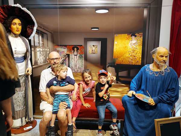 We left the theater and had to get into the "boats" on the other side. And that was the whole museum and last part of the half-hour program. Tammy, Emmy and I sat in the first row, Randy and Sammy further back. However, Sammy wanted to be with me again, so Randy moved up closer to me. Half-way through the ride he finally put some goggles on Sammy, and he actually enjoyed the VR ride. Yes, we all put on goggles and took a boat ride through the Viennese canalisation system, then flew over the city of Vienna. There was one scary part, where I pulled Tammy's headset off of her and thought I'd also moved Emmy's who was sitting further away, but he said that he had seen it all and had not been scared.