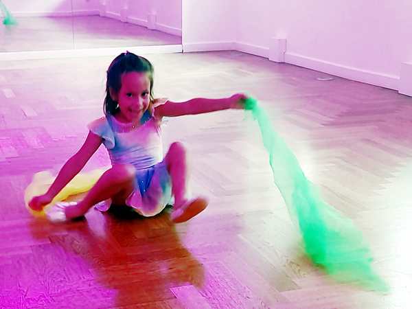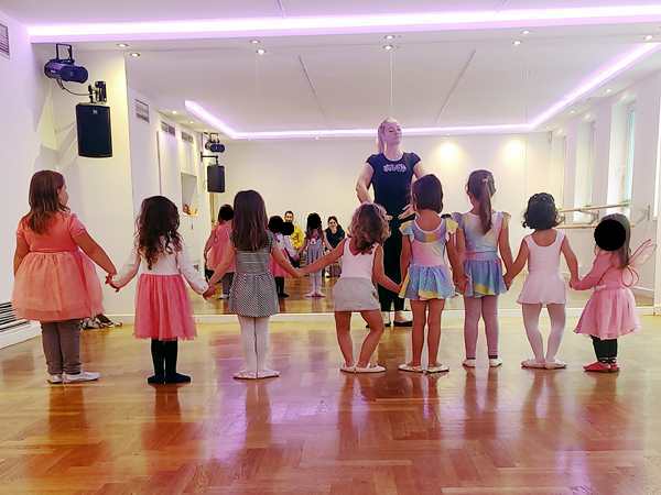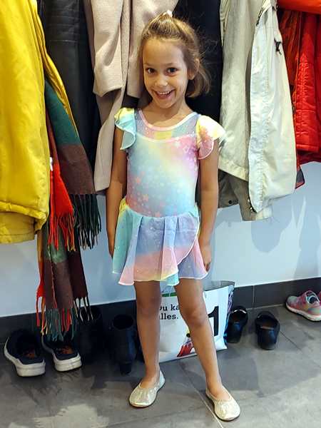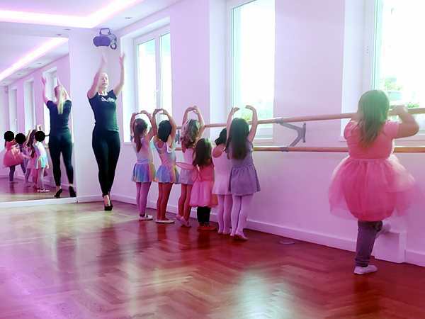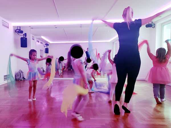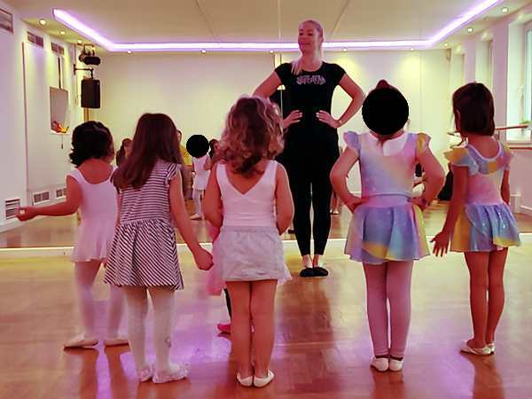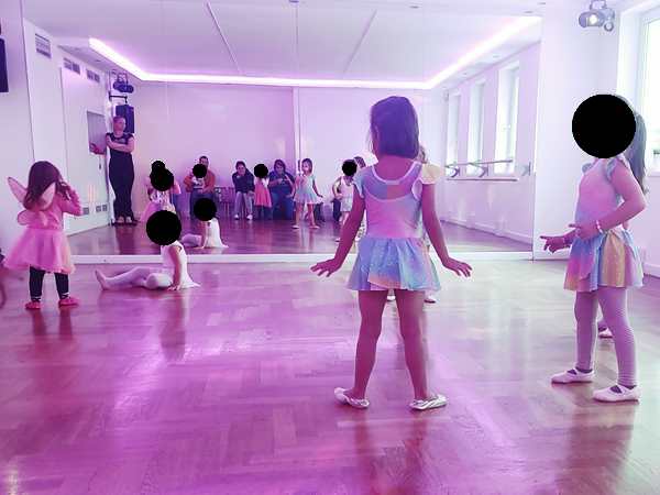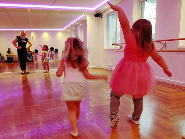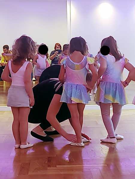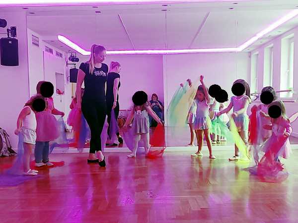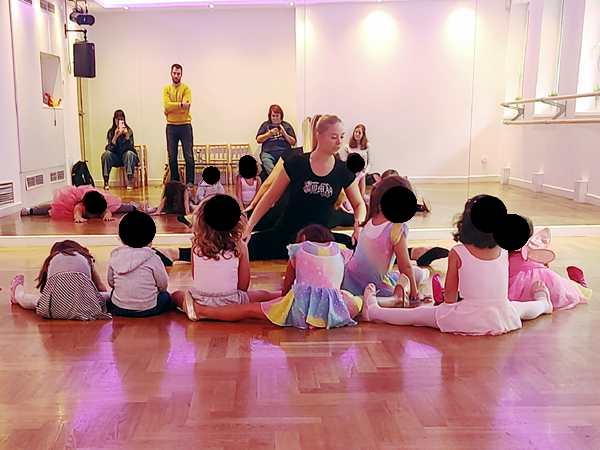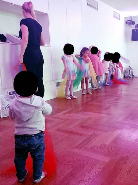 Tammy had been at that class once a month ago, but the kids' schedule has had a lot of movement since then. The way this school works, you can always join in in the first week of the month, and that was today, so it was her second time at a ballet class ever. Tammy had a new dress on and was very excited. After a few more minutes, more children had arrived, and the class started at 4:30 pm.