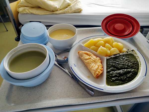 It was 1 pm, and I was getting hungry. At about 1:30 pm they brought my food. It was quite a big portion of cremed spinach, potatoes, an omelett, pea soup and a vanilla pudding.