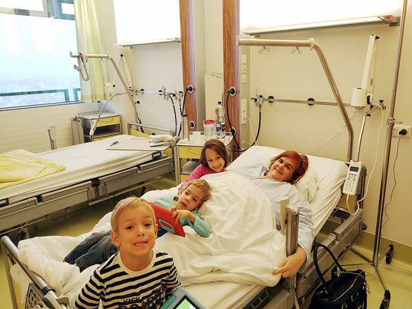 There were two beds in the room, and the other bed was occupied, but the occupant not there. The nurse then came to measure my blood pressure and do an ECG. While she was doing it, my bed neighbor arrived, but left the room again. A while later she returned and sat down on her bed. The kids tried to talk to her, but she didn't want to talk. She was dressed in street clothes and was gone for good a while later.