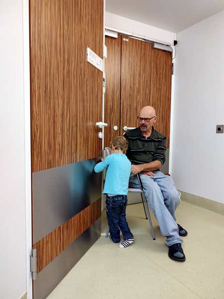 We took the subway downtown, then the tram. But when we got to the tram stop, it was a 12 minute wait; that was pretty long. It finally came and we got off by the hospital, then walked to the hospital and to the station I had been told. Green elevators to the 16th floor, station E. We walked to where the nurses were, and I told them I had come to stay. We all went to the waiting room right there to wait. The kids were all on their tablets. I had some papers to fill out. After a while, the nice nurse that took care of me all day showed us to my room - room 8.