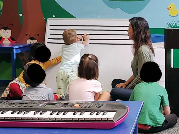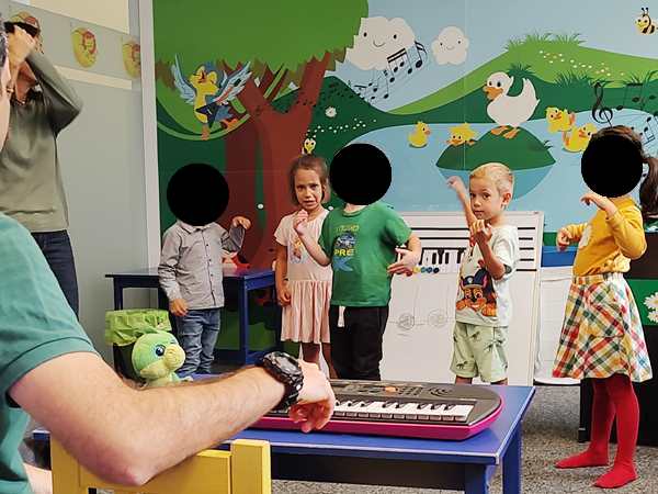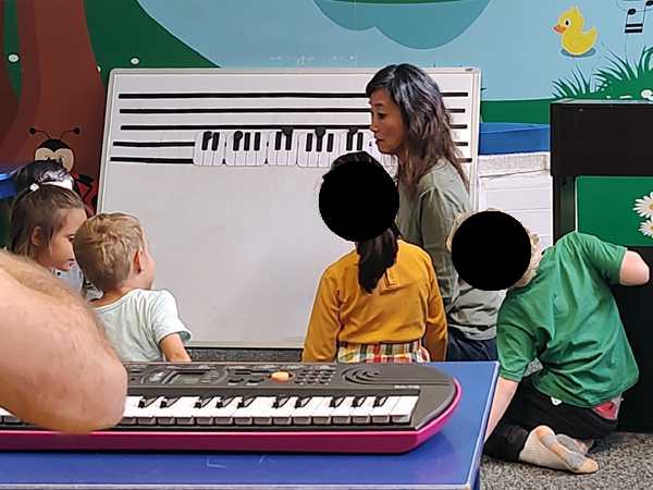 As every other teacher, she started with the greeting song, but she had the kids sit on the floor in the front and made them sing. Emmy was the loudest singer and did a great job. The teacher actually praised him several times. Then she had them sit at their pianos before they came back to the front. In fact, they went back and forth between the front and their pianos a lot. She reviewed the piano keys and the length of notes, and she had them play the right notes with the right fingers. They even did something new - whether intentional or not - when they played the black keys for the first time.