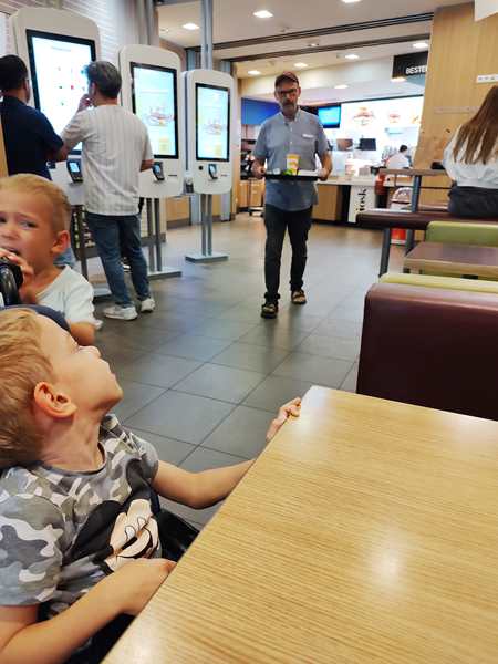 We walked back to the subway, but got on the other line and rode it only for one stop, then switched to yet another line. We rode that line for quite some time, much to Sammy's delight. After we got off, we walked to the McDonald's there. It was just after noon, which was perfect. We used to go to that McDonald's, when they'd had their swim class right there two years ago or so. I was glad that it was not packed and that we found a table easily. We had a good time eating and left earlier than necessary at about 12:50 pm.