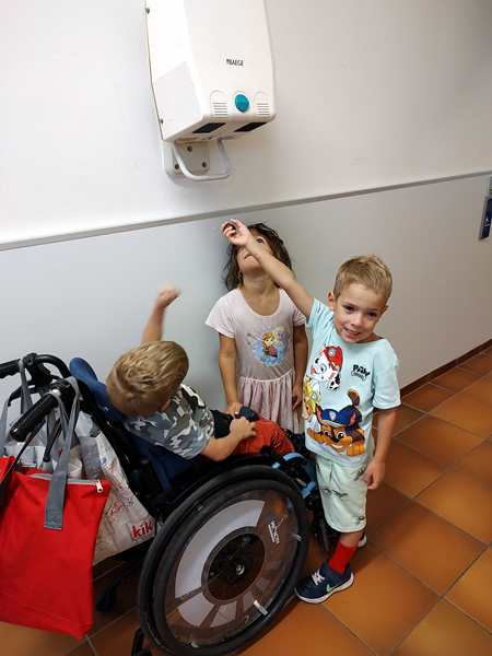 After a while we were all getting red eyes, and the first kid wanted to leave. Randy had wanted to leave much earlier already, but then we actually did. We walked back to our private changing room, and after having been dressed, the kids enjoyed the hot air coming out of the hairdryer on the wall. Then we left.