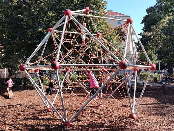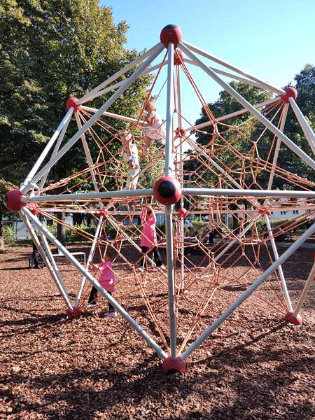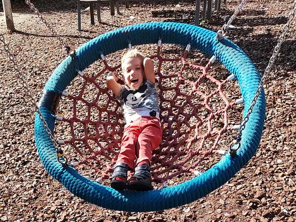 There was a playground right there, and so the kids asked to go there. Randy was very tired and didn't really want to, but we went there. The kids were having lots of fun. I put Sammy in the swing and let him go high, while Emmy wanted to climb to the top of this thing and have me watch him. He then surprised me more in how fast he went down, sometimes just swinging off the ropes. They did a few things, then we left to go home, even though they would have wanted to stay longer.