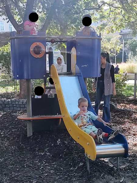 We left the pool and went straight to the kids' pool, where the water was so very warm and pleasant. Still, Sammy's lip was still quivering for a while before it stopped. We then had lots of fun together in that kid pool that was actually quite a good size, and there were lots of kids in it.