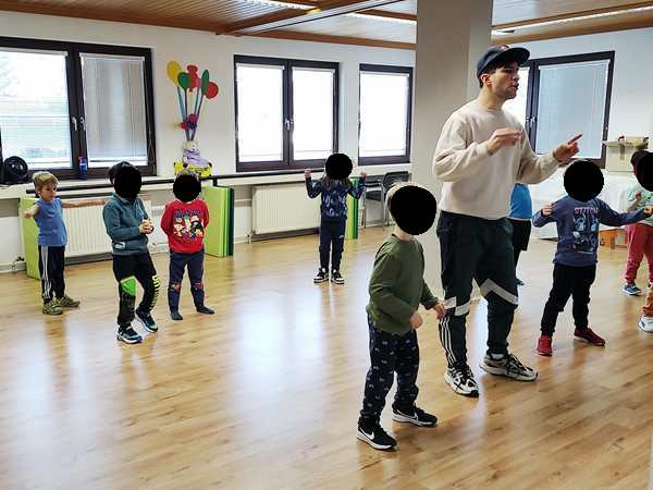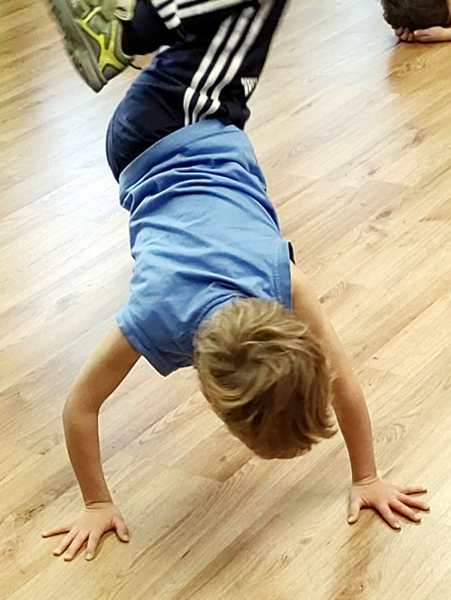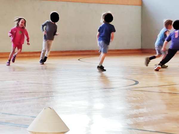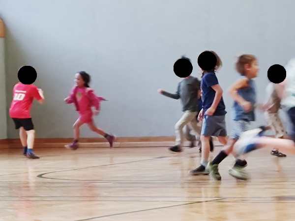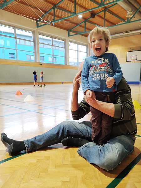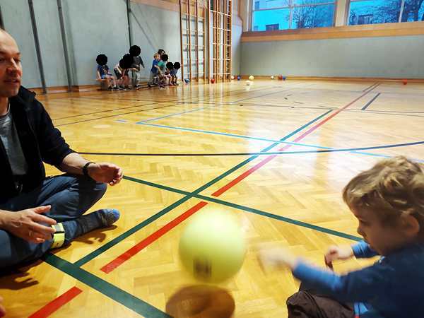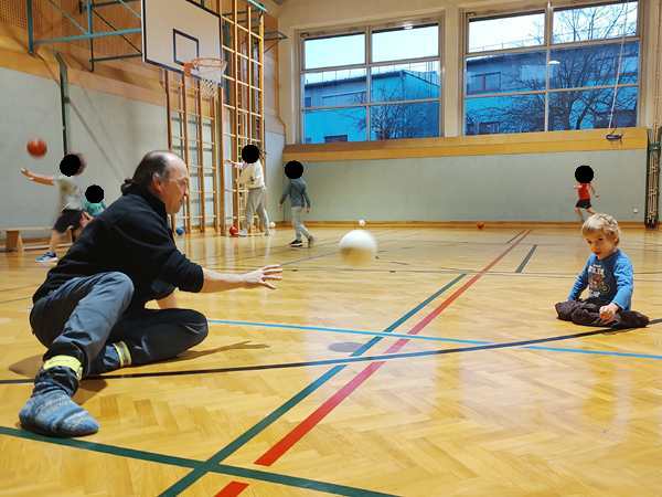 Just before the class ended, I waved Emmy to the locker room, so we could get dressed and leave. The ball-playing class starts at 4:30 pm now, so we have only 15 minutes between classes, which is not much. And so we were the first ones to leave, rode our scooters to the tram stop, then took the tram for 3 stops and rode our scooters to the school, where the ball-playing class is taking place. When we walked into the building, Randy was already there with Tammy and Sammy and getting ready to go inside. We joined them and all walked into the gym together. That included Sammy's friend Michi with his son.