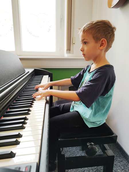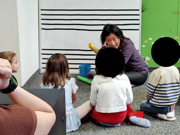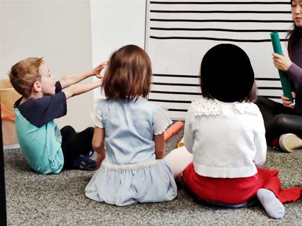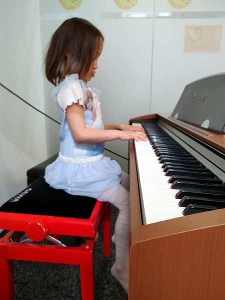 It was a warm and sunny day. We took the subway downtown, then walked to the music school, where we arrived early. At 10:30 their class started. The teacher did the greeting song, then did the breakfast food guessing game again. Next she had them do a finger exercise in the air, fingers touching the thumb, then they did the finger exercises on the piano. Next they did the song they're playing now.