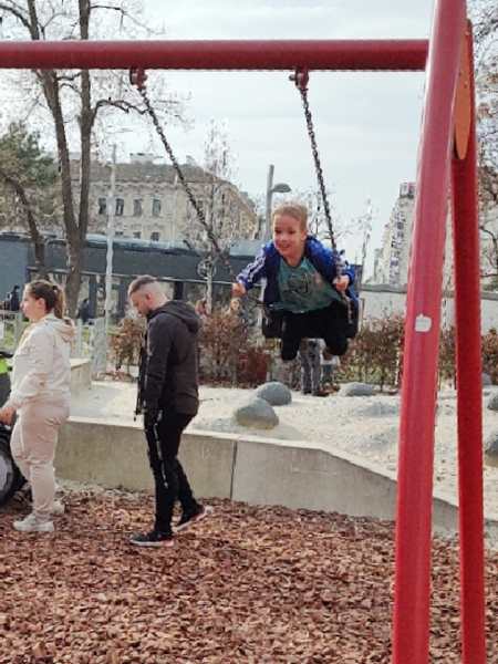 Sammy was ready to leave, so we already left at 12:45 pm, an hour before their swim class was to start. We crossed the square, walked into the pool building and bought our tickets. Then we walked around the building to the wheelchair entrance, where they let us in. We got changed and walked inside. We still had plenty of time until the class at 1:45 pm, so we all went into the warm baby pool. Tammy and Emmy had their diving goggles and had lots of fun. Sammy also had great fun. Emmy did somersaults backwards in the water, and Tammy somersaults forward. Both tried to do handstands in the water.