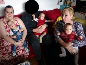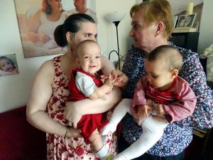 Once back at the apartment my Mom and her husband were already waiting for us. They had 2 hours to spend with us. I had bought some cakes, and so everyone had cake and coffee - and I had my fruit (day 7 of my diet). At first my Mom's husband wore his mask, that he then took off, and in the end he held Emmy. I also tried to take another picture holding all three, but did not get a good one. We had a great time with Grandma and Grandpa, and after a while Emmy had lost his fear again. The 2 hours are always up too quickly.