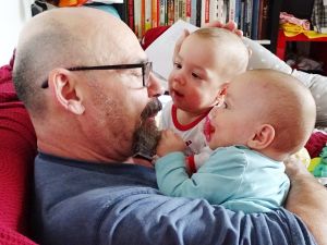 Sammy was having a hard time, and Daddy knows exactly how to make him smile and laugh. I had Emmy, who also had a hard time, but needed to set him down for a moment to do something. As he would have cried if I had put him into the crib, I asked Daddy to hold him for a moment. We don't hold two at once any more very often. So this is how this picture (and video) came to be.