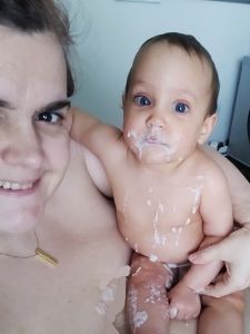 Tammy is a different story. I closed the door between the two rooms, so Emmy wouldn't be woken up by her. Even after I picked her up, she was still whiny. When I put the first spoonful of food into her mouth, she burst into tears. It was way overdue for her to eat, so I knew she was hungry. Well, food was not possible. I put some dental cream on, figuring her upcoming tooth was hurting her. I continued trying to feed her, and gave her liberty she doesn't usually have while eating, just to get something into her. That meant making a big mess, but that was okay. After a while the cream must have started working, as she calmed down and started eating.