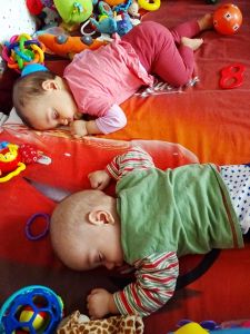 After they left, I was thankful that both Tammy and Emmy fell asleep and slept for a while. That way I was able to also sleep at a time when I'm usually asleep. The three of us got up at the same time, and I got their food ready. It had been a while since they both had had their last bottle of milk. I fed Emmy half his jar, but then put him down, as Tammy was crying because she was so hungry, and Emmy is sometimes hard to feed and it goes really slow. Tammy ate her food fast, and then I fed Emmy the rest, and everyone was happy. It was then that the boys returned from physiotherapy, and Sammy got to eat as well.