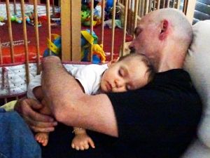 Tammy and Emmy enjoyed the water for a while longer, and we fed them after their bath, before putting them to bed. At first Emmy was fine, falling asleep, but Tammy is now used to being rocked to sleep. However, one time she cried, it woke Emmy up, and I ended up lying down with him to rock him to sleep. It didn't take long before I could put him back to bed; it takes a little longer for Tammy. It's a cute picture of her and her Daddy sleeping together.