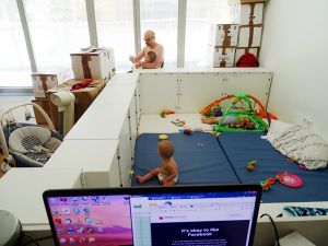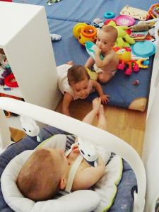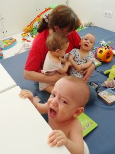 On the first picture you see the view from my office desk while standing. I'm right next to the babies, but I really don't get to ever sit down there all day long right now. We fed the babies their lunch, and while I was cooking our own lunch, our friend Sonja returned to help. I was so glad! It is still impossible to walk away from the babies even for a minute right now, as they cry, just as Emmy in this picture. Usually, if somebody is here to be with the babies, like today, they get over it fast as they get distracted. I was so thankful for Sonja, as this afternoon ended up crazy busy. So much so that I forgot to watch the time, so that the babies got their second meal really late! I'm surprised they didn't complain about it earlier. The only reason I noticed was that I heard Sammy crying. He'll always let you know when it's mealtime. Today we fed them a 10 jar for the first time, meaning it's from 9 months old and up. Sammy is a little behind, and we had to give him a little more time in the past, and today he did not want to eat that jar either. The others did not have a problem with it.