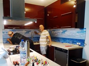 I went straight back to work after they had been fed. Another friend came today to help Randy put all the foils up. They were supposed to put the kitchen backsplash foil up, as well as the black foil to cover the glass upstairs where the bright light from outside comes through and disturbs the babies at night, as well as a mirror foil on the windows downstairs so that people cannot look inside. Well, only the first one happened, as we needed some of the cleaning supplies that are still at the old apartment. But the kitchen took a long time, and they were a great team. They got it done! What do you think? Isn't it great? I love the ocean, and now I get to see it every day.