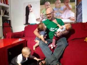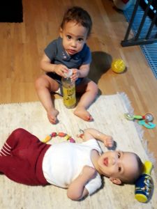 Anna was playing with them downstairs, and Randy joined her when Sammy was getting cranky, while I worked upstairs and then made their food. They also had their dinner a little later than usual, and we each fed a baby. Again Emmy did not want to stay in his chair for long, but needed to get out and move around, and I'd put food into his mouth until he did not want any more.