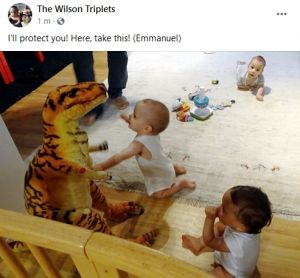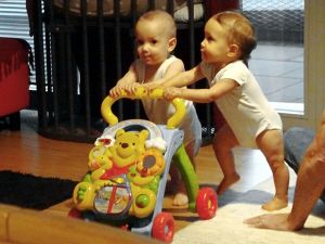 After lunch Tammy was really cranky for a while (she might be getting another tooth, as there are some signs for that), but later that subsided, and they were all playing happily. Randy played with them and helped them out. Like when Tammy (and Emmy) walked around with the cart and had trouble with the curves. And then Emmy conquered the dinosaur to protect his siblings. I noticed that Emmy was the hero of most events and pictures today.