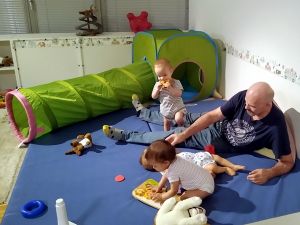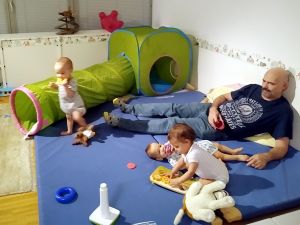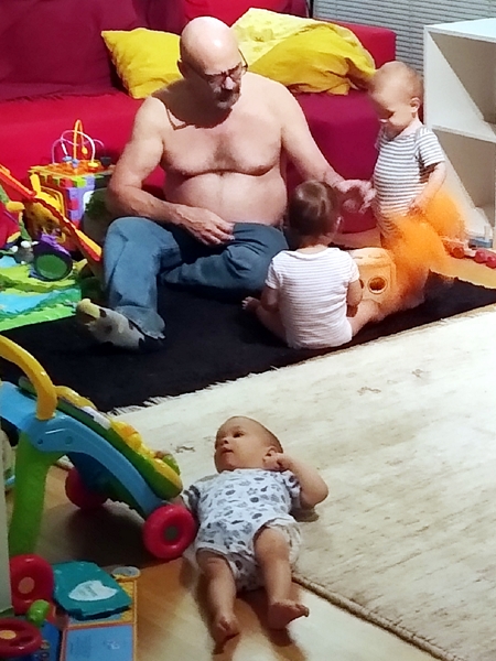 And this afternoon they did better than usual, no crankiness, they were all playing happily, with Daddy being with them, while Mommy was working. It was beautiful to watch! Sammy did some crawling around, while the others now walk all the time.