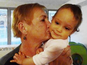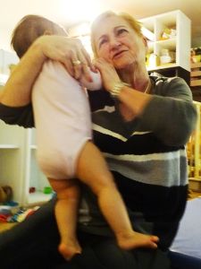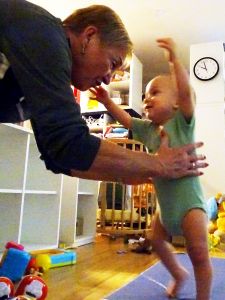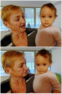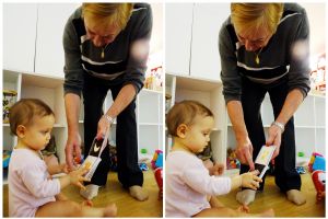 3 am has become my regular bedtime; it was a little later, so again only 5 hours of sleep until I had to get up to make their food. At 9 am we sat down to feed them, and we had just started, when Grandma arrived. Normally we go swimming on Thursdays, but not this week because school kids are on fall vacation. So Grandma came to visit us instead, which was great fun, especially as she hadn't been here in a long time, since the swim class started. She helped us to finish feeding them, and then we put Sammy to bed, and took the other two downstairs. They have not been sleeping this early recently, that's why. At first I lay down, but I heard Emmy cry, and Randy was eating breakfast, so I got back up and joined them downstairs. And that's how I got all those great pictures and videos. I'm not sure who had more fun, Grandma, or the little ones. It sure was fun to watch them!