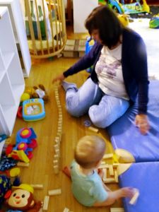 So we were on our own again when we fed them. Since Tammy didn't seem tired yet, we took them all downstairs and Randy stayed with them, while I went to work cooking. I was just finishing, when our friend Sonja arrived to help, and she joined us eating lunch. I still had to do the French translation of the newsletter, but I didn't get far. One of them always needed to be with me, usually Sammy or Emmy. I finally gave up and joined them, and got the wood blocks (Jenga) out Randy had just bought cheap. First we built a tower, but they were more interesting in chewing the blocks than destroying the tower. Then I set them up like dominoes, so I could make the first one fall, which causes all the others to fall, but that wasn't that interesting either.