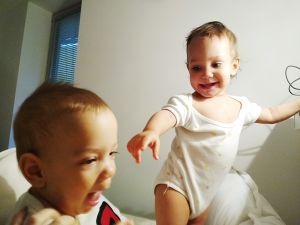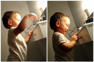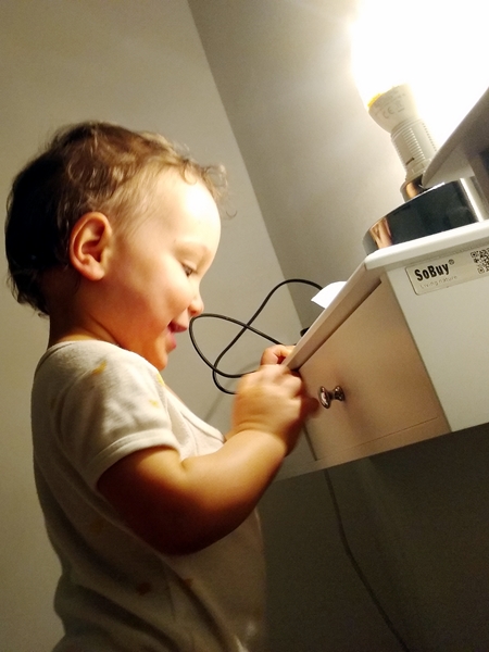 We fed them at 12:45, and then they all went downstairs, while I cooked lunch for us adults. We both ate downstairs, and by the time we were done, it was pretty much time for their afternoon nap. At 2:15 we put them back to bed, the boys in their beds, and Tammy was lying down with me. After twenty minutes, I decided to put the girl into her bed, as Emmy had woken up and needed me, so I picked him up and lay down with him. A sick boy should have priority, right? However, the girl cannot fall asleep by herself during the day. After ten minutes, I switched again, and asked Daddy to rock Emmy to sleep, which he did. The girl also fell asleep on me after only a few minutes by then, but she didn't get to sleep long. Randy had sat down with Emmy at 2:45 pm, and at 3 Sammy started crying. He was crying and crying, and my Mother's heart was torn. It's so much easier when you only have one baby! After 15 minutes, I could not take it any longer. I let the girl slide onto the bed, and was happy that she continued sleeping. Then I picked up Sammy and comforted him, but then I made the mistake of lying back down with him. That woke up the girl, so she only had 25 minutes of sleep. And then the party started! They all love being in our bed, and the drawers and what's on them are the most intriguing to them. Especially the lamp that changes intensity when you just touch it! Watch the video I've uploaded.
