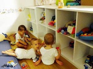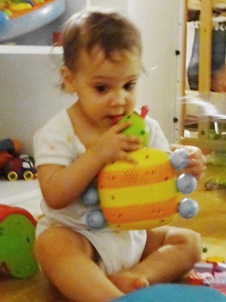 Then we all went downstairs to play. Half their shelves with toys are turned around, and about every two weeks, I turn them all around so that half the toys are gone, and two weeks later when they return, they are interesting again, like new toys. I turned them around when we got downstairs, and that kept them all pretty busy and occupied, to discover all the new toys.