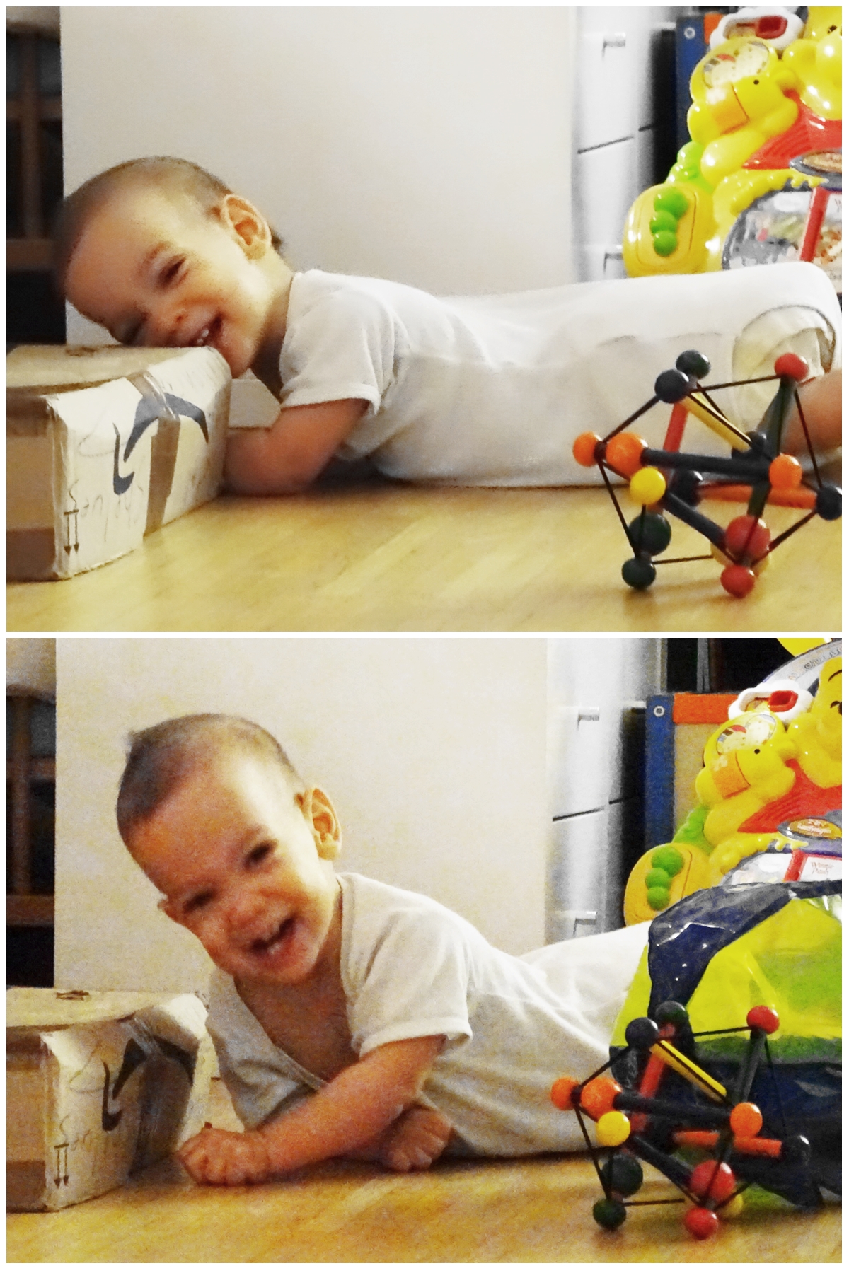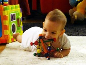 By the way, they have all been talking quite a bit, and for the past few days, they've been saying "mama" intentionally, most of all Emmy, then Sammy, and Tammy the least. Today Tammy was on the rocking horse again, after I moved it out into the open, and she could really make it move. One time she actually stood up and rose her hands up, and it's captured on the video I'm uploading.